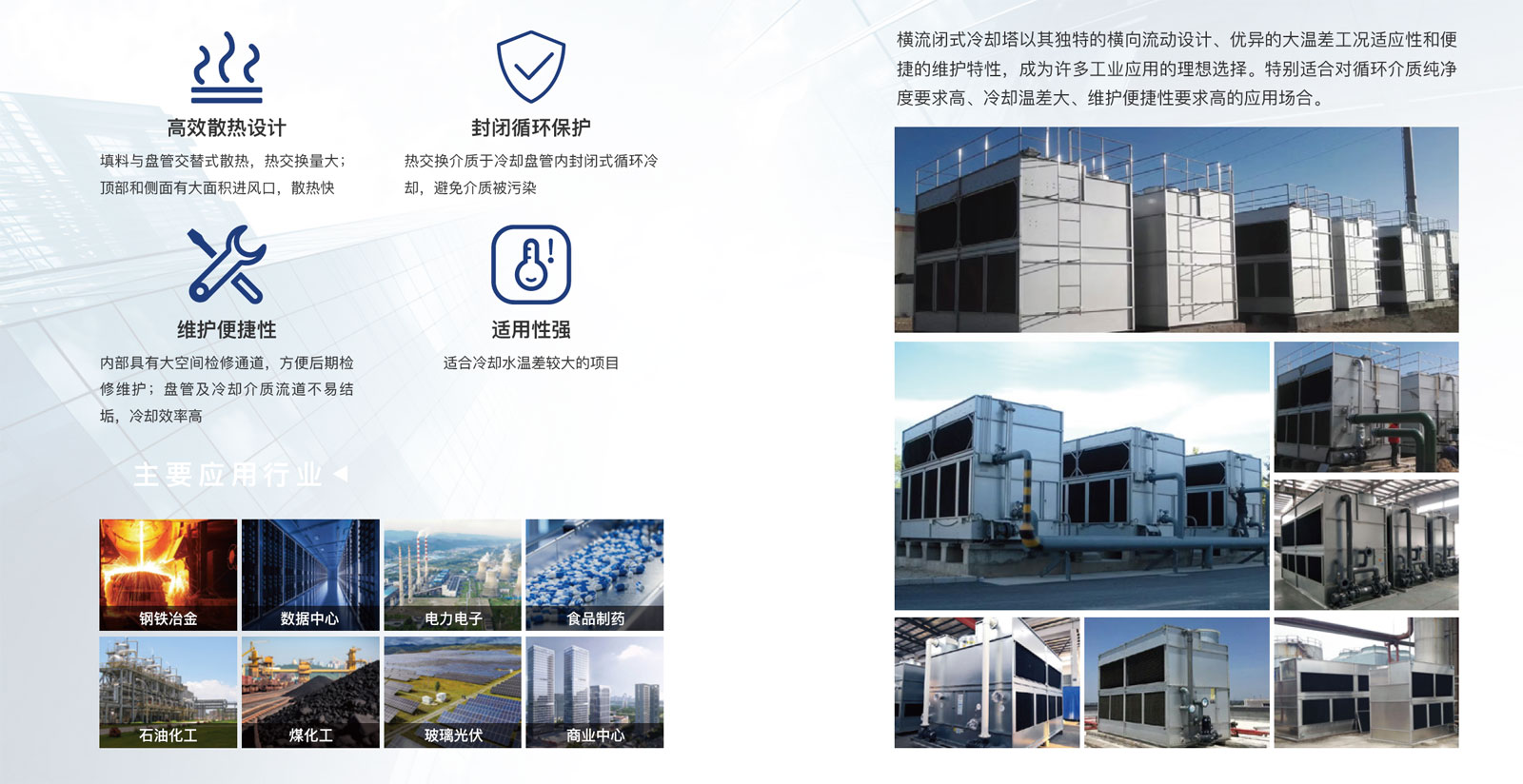 横流闭式冷却塔是一种采用横向空气流动设计的封闭式冷却设备,空气从塔体侧面进入,横向通过填料层和换热盘管,与垂直向下的喷淋水形成交叉流动进行热交换。这种独特的流体力学设计使得横流闭式冷却塔在特定工况下具有显著优势。