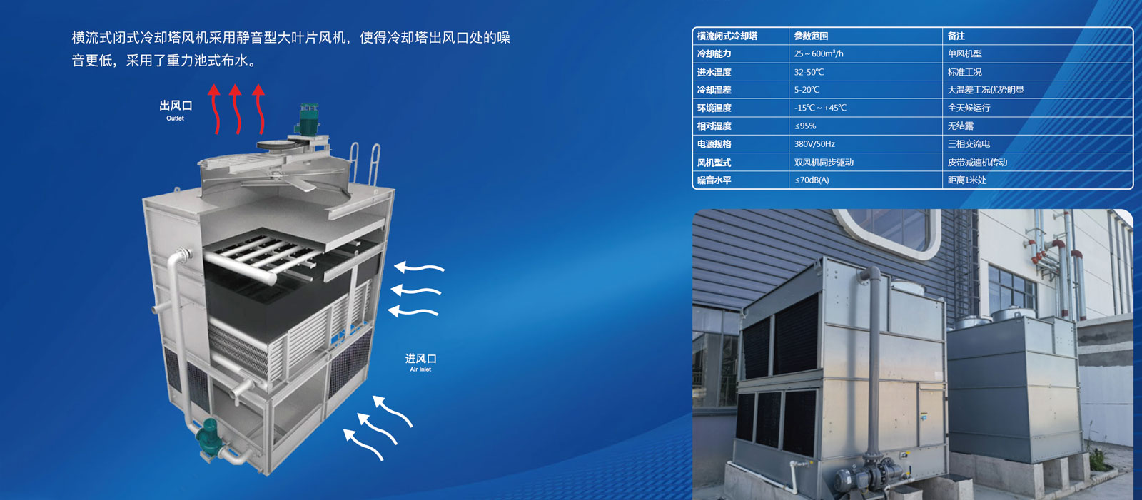 空气流动系统: 外界空气从侧面大面积进风口进入,横向流过填料层和冷却盘管,与垂直的喷淋水形成交叉流动,吸收热量后的湿热空气由顶部风机排出