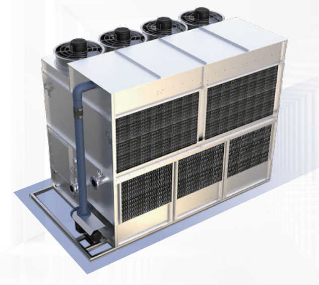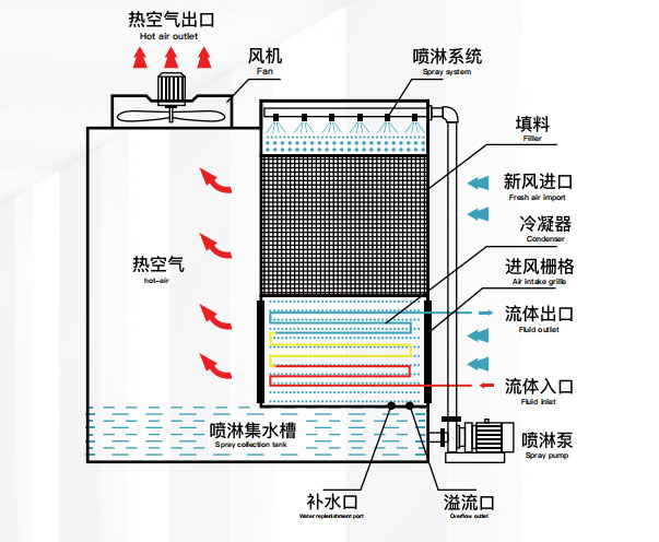 内循环水系统(封闭循环):盘管内被冷却后的循环水从塔体流出,由系统循环水泵送往热源(被冷却设备),经过换热升温的循环水再进入盘管冷却。