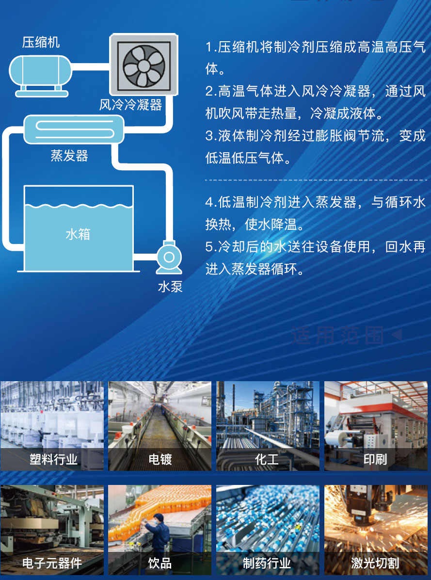 设备广泛应用于塑料成型、激光设备、电子制造、医疗器械、食品饮料等行业,满足设备对温度控制的严格要求。具有安装灵活、维护简单、运行稳定的特点,避免了水质处理和管道腐蚀等问题,降低了整体运营成本。并且该设备配备压缩机和风冷冷凝器,制冷效率高,能耗低,符合节能环保要求,是现代工业的冷却解决方案。