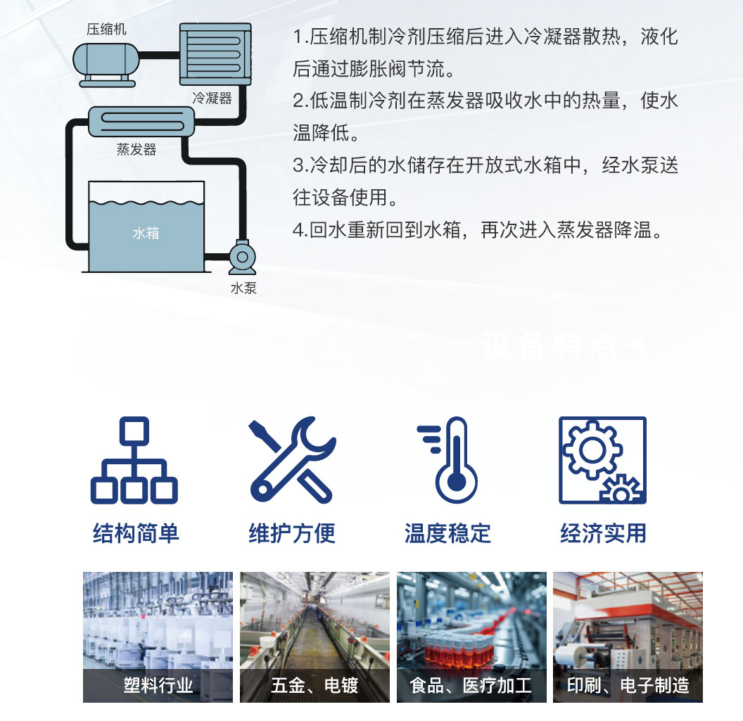 开放式工业冷水机是一种直接蒸发式冷却设备,通过水与空气的直接接触换热,为工业生产提供稳定的冷却水源。 该设备广泛应用于注塑、化工、电镀、食品加工、纺织印染等行业,满足各种工艺对冷却水温度的精要求。具有制冷量大、运行成本低、维护简便等特点,相比封闭式系统投资更经济,是中小型企业的理想选择。该设备配备高品质压缩机和换热器,采用环保制冷剂,符合节能减排政策,助力企业绿色发展。智能化控制面板,可调节出水温度,具备多重安全保护功能,确保设备安全稳定运行。