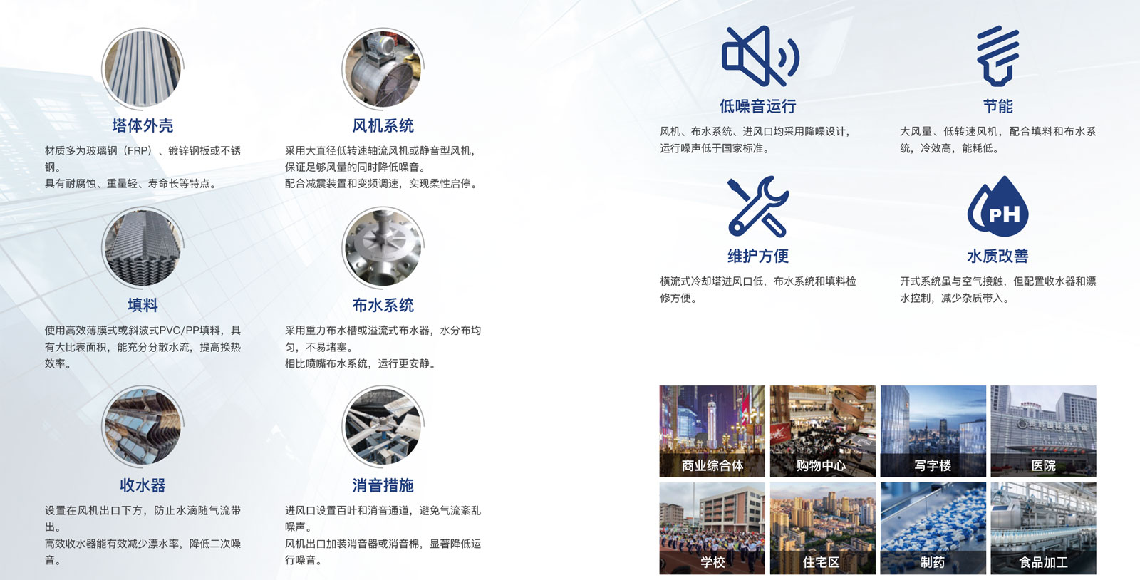 低噪音横流式冷却塔是一种开式冷却设备,水流从塔上部垂直落下,空气水平流动通过淋水填料,气流与水流正交进行热交换。采用专为冷却塔设计的FRP材质机翼低噪声轴流式风机和低噪声电机,显著降低运转噪声。按噪声等级分为普通型、低噪声型、超低噪声型、工业型,其中超低噪声型符合环保要求。若配用双速电机,夜间低速运行时噪声还能再下降2-3dB(A),特别适用于对环境噪音要求严格的场所如居民区、医院、学校等周边区域。