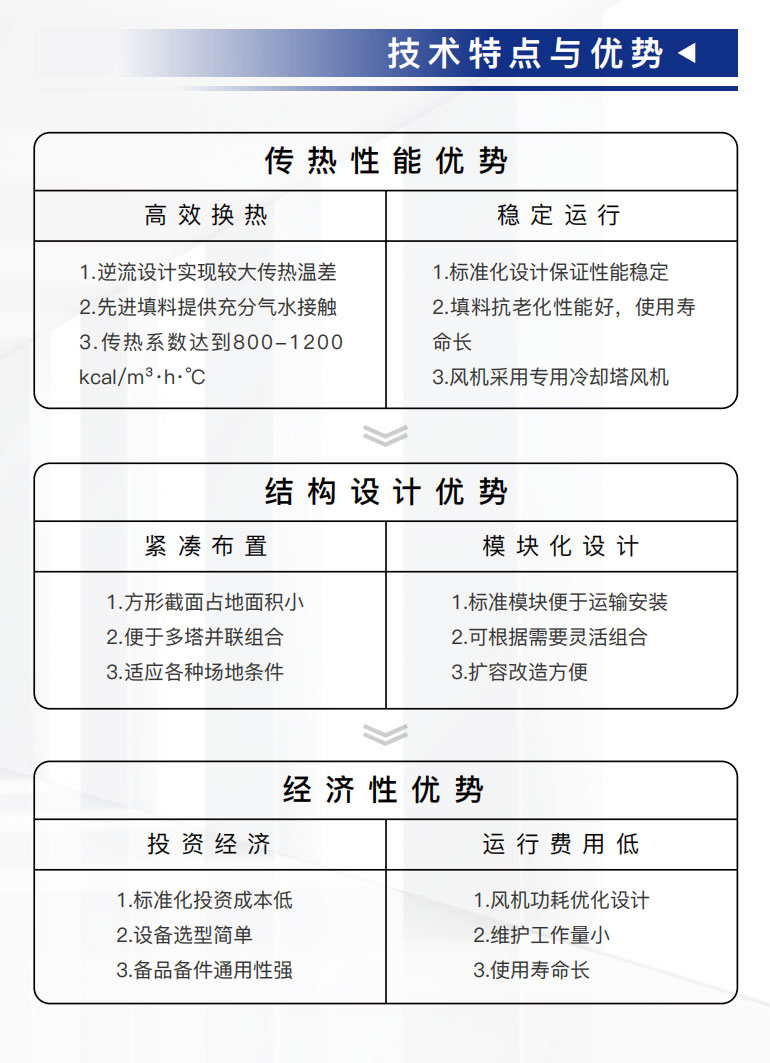 方形逆流式冷却塔是一种开式冷却设备,水流在塔内垂直落下,气流方向与水流方向相反进行热交换。热水从上到下淋洒,空气从下向动,这种冷却塔的冷却效果更好,占地面积相对较小,但配水不够均匀,塔体高度大是其特点。逆流式冷却塔适用于高温冷却水使用,特别适合工矿企业水温冷却要求高的环境。相比横流式,逆流式在冷却效率和占地面积方面具有优势,是工业高温冷却的理想选择。方形设计便于多台并联组合安装,模块化结构使得系统扩容和维护更加灵活方便。该产品广泛应用于钢铁、化工、电力等行业的循环水冷却系统,能够有效处理大流量、高温差的冷却需求。