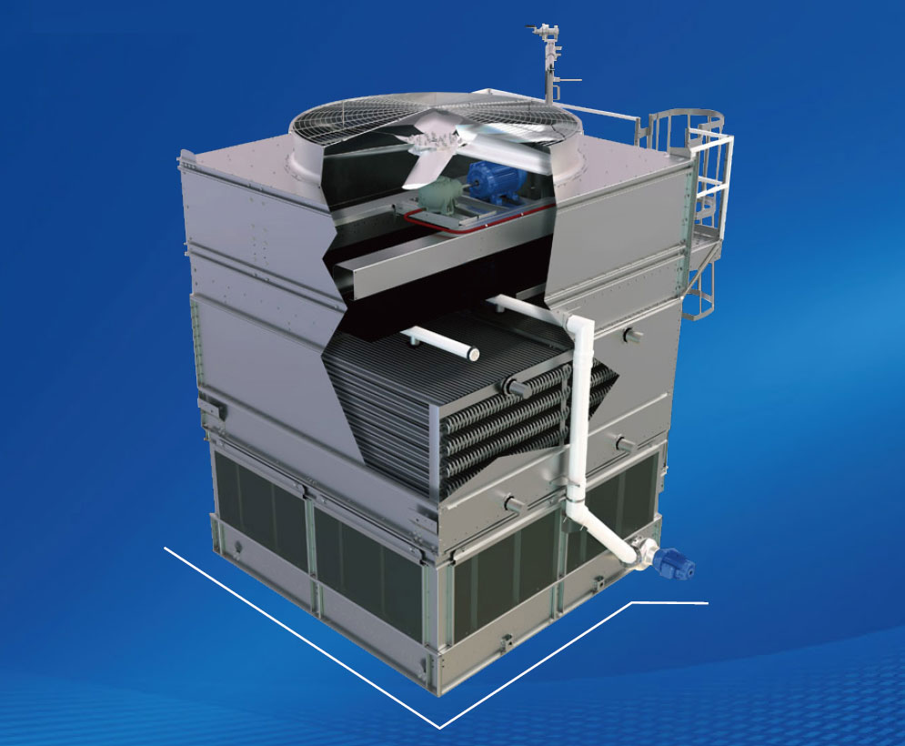 蒸发式冷凝器又叫蒸发冷、冷却(凝)器,利用盘管外的喷淋水部分蒸发时吸收盘管内高温气态制冷剂的热量,从而使管内的制冷剂逐渐由气态被冷却为液态的一种设备。由轴流机、喷淋嘴、电子水除垢仪、集气囊、填料、高除水器、冷却管组、填料集水槽、水泵、集水器、箱体等部件组成。 蒸发式冷凝器是一种结合了水冷和风冷优点的换热设备,通过水的蒸发潜热和空气的显热同时带走制冷剂的冷凝热量,实现制冷剂的冷凝过程。